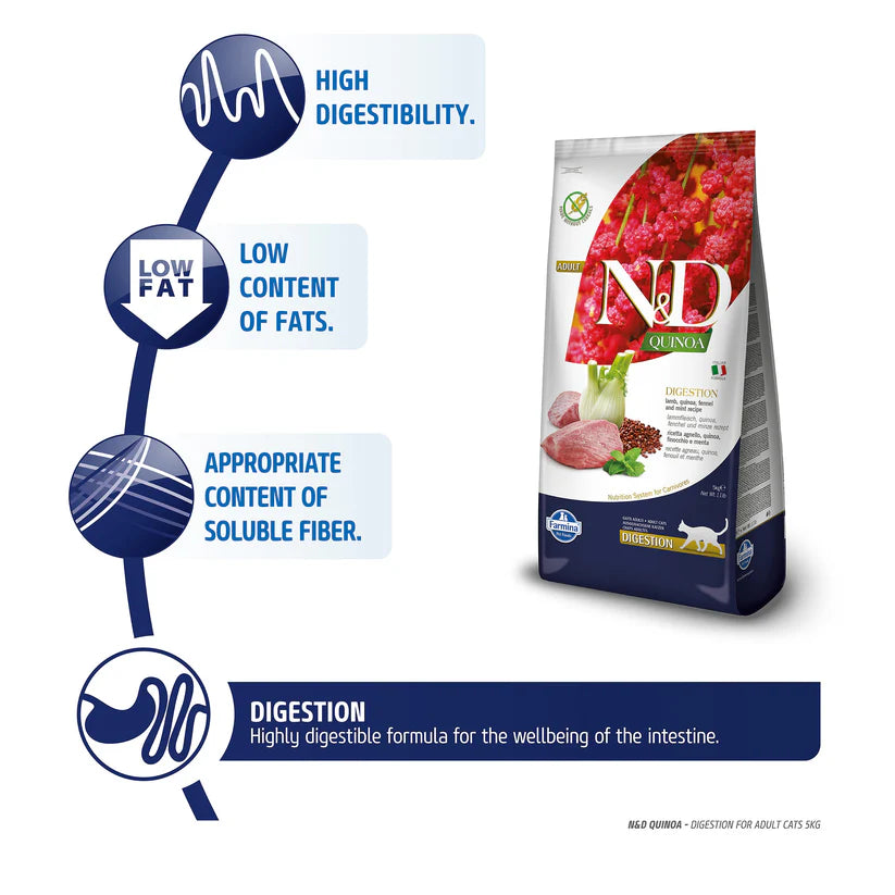 Farmina N&D Quinoa Digestion Lamb Adult Dry Cat Food is a premium, nutritionally balanced formula that supports your adult cat’s digestion and overall health. It’s made with high-quality lamb, a single source of protein, making it ideal for cats with sensitive stomachs or food intolerances. Additionally, quinoa, an ancient grain, is included as a highly digestible carbohydrate source. This helps promote digestion and energy without causing discomfort.